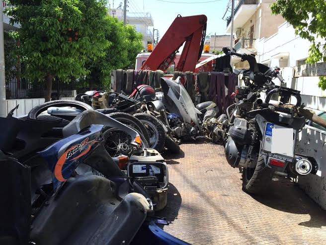 Μετά από έρευνες στην αποθήκη στον Κορυδαλλό και σε αποθήκη στο σπίτι του 49χρονου στα Πετράλωνα, βρέθηκαν και κατασχέθηκαν μεγάλος αριθμός εξαρτημάτων μοτοσυκλετών και πλήθος εργαλείων που χρησιμοποιούνται για την αποσυναρμολόγηση τους.