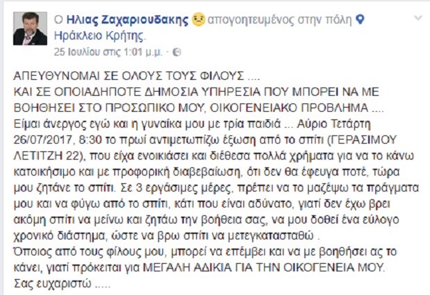 Όπως αναφέρει το cretapost.gr, πριν από τρεις ημέρες ο Η.Ζ, μέσω σελίδας κοινωνικής δικτύωσης, έκανε έκκληση σε γνωστούς και φίλους να του συμπαρασταθούν, ενώ ζήτησε από την ιδιοκτήτρια να του δοθεί ένα εύλογο χρονικό διάστημα για να βρει σπίτι και να μετακομίσει. Είναι και οι δύο άνεργοι, ενώ η γυναίκα του αντιμετωπίζει προβλήματα υγείας.