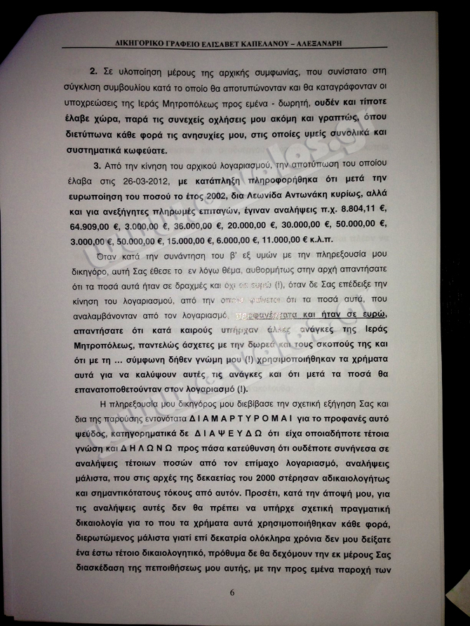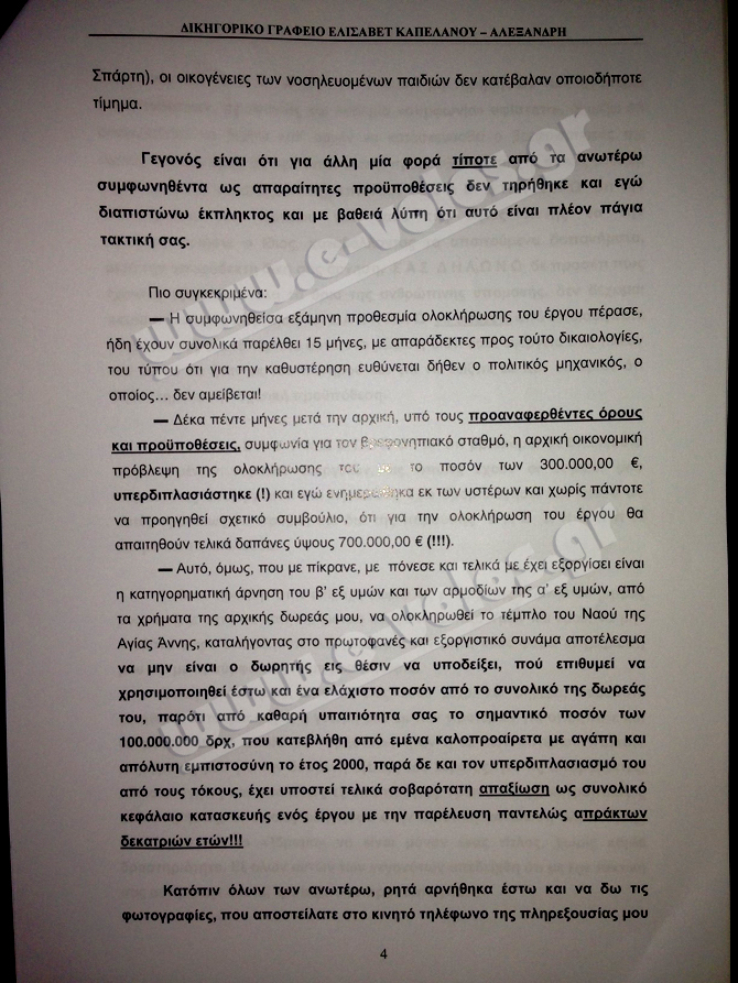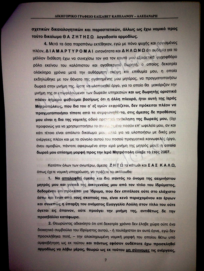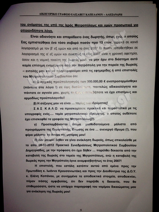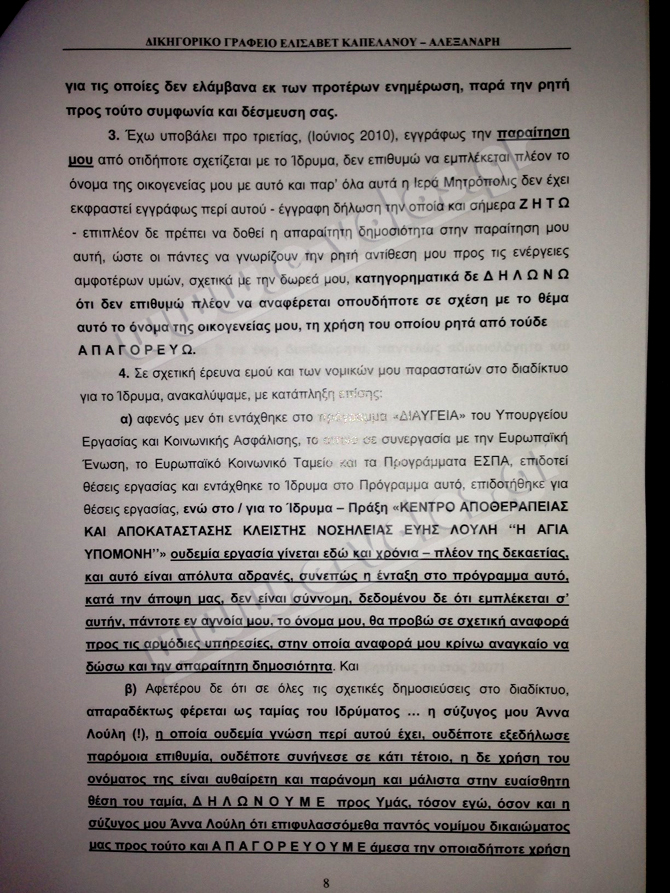 Όπως προκύπτει από το εξώδικο του κ. Λούλη κατά της Μητρόπολης και του Μητροπολίτη Ιγνάτιου, όχι μόνο δεν έγινε το έργο, αντίθετα τα χρήματα έκαναν “φτερά”, μετά από συνεχόμενες αναλήψεις και επιπλέον στήθηκε ίδρυμα που επιδοτείται από ευρωπαϊκά προγράμματα, στο οποίο μάλιστα ως ταμίας εμφανίζεται η σύζυγος του κ. Λούλη, χωρίς η ίδια και ο σύζυγός της, να έχουν την παραμικρή ιδέα.