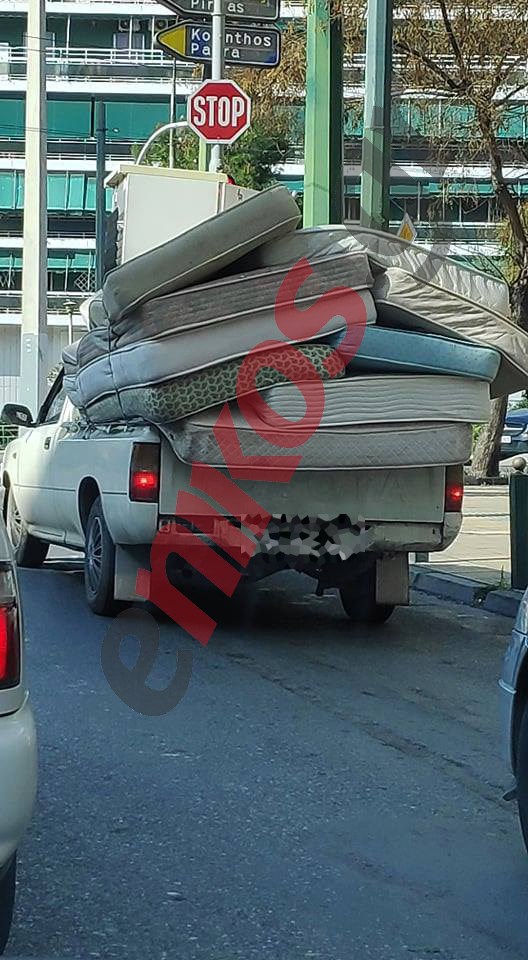 Πολύ συχνό το φαινόμενο, περισσότερο από Ρομά, οδηγοί να φορτώνουν το αυτοκίνητο, μέχρι εκεί που δεν πάει άλλο. Κυκλοφορείς δίπλα σε αυτά τα αυτοκίνητα και νομίζεις ότι από στιγμή σε στιγμή θα σε… καταπλακώσουν. Στην προκειμένη περίπτωση, τα στρώματα που έχει φορτώσει ο συγκεκριμένος οδηγός και το ψυγείο.Μετρήσαμε 9 στρώματα και ένα ψυγείο. Ελπίζουμε κάποιο… περιπολικό να τον… πετύχει κάπου, πριν γίνει ατύχημα. Δείτε τη φωτογραφία που μας έστειλε αναγνώστης του enikos.gr :