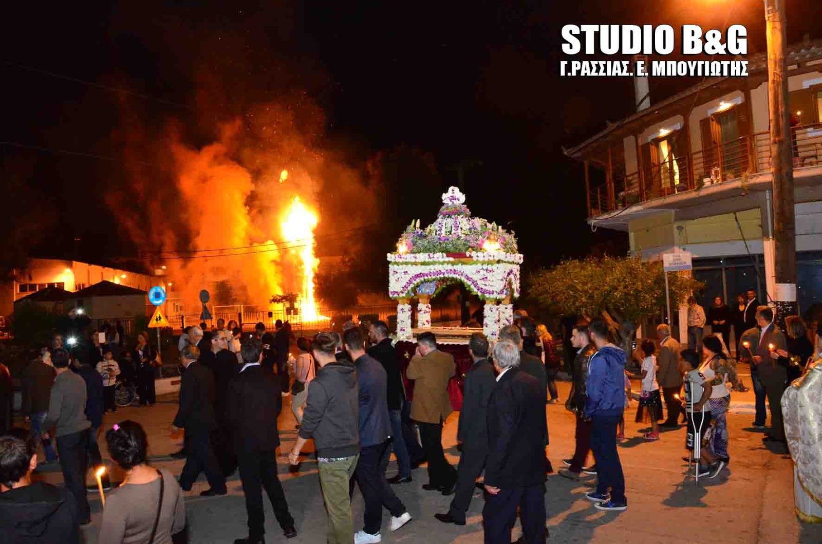Κατά την ώρα της περιφοράς του Επιταφίου ο Βαραβάς παραδίδεται στην πυρά, ενώ πολύχρωμα βεγγαλικά πλημμυρίζουν τη νύχτα με ήχο και φως.