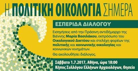 Εκδήλωση διαλόγου και προβληματισμού με θέμα «Η πολιτική Οικολογία σήμερα: προς τα πού και με ποιον τρόπο» διοργανώνει αύριο Σάββατο το Οικολογικό Δίκτυο.