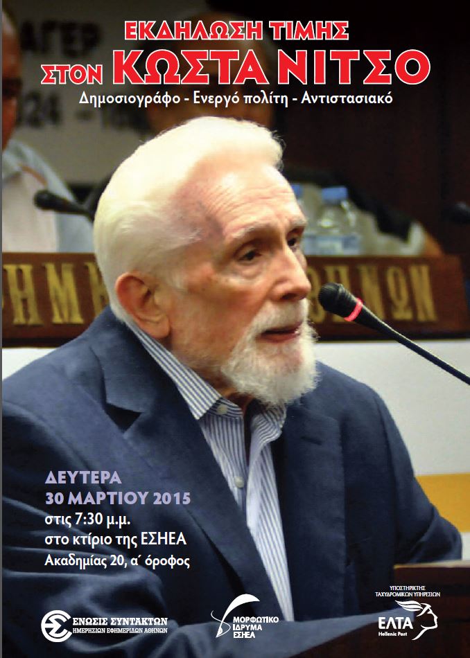 Εκδήλωση τιμής στον Κώστα Νίτσο, δημοσιογράφο – ενεργό πολίτη – αντιστασιακό, οργανώνει η Ένωσις Συντακτών Ημερησίων Αθηνών και το Μορφωτικό της Ίδρυμα τη Δευτέρα 30 Μαρτίου, στις 7.30 μ.μ. στο κτίριο της ΕΣΗΕΑ, αίθουσα «Γεωργίου Καράντζα», Ακαδημίας 20, α΄ όροφος.