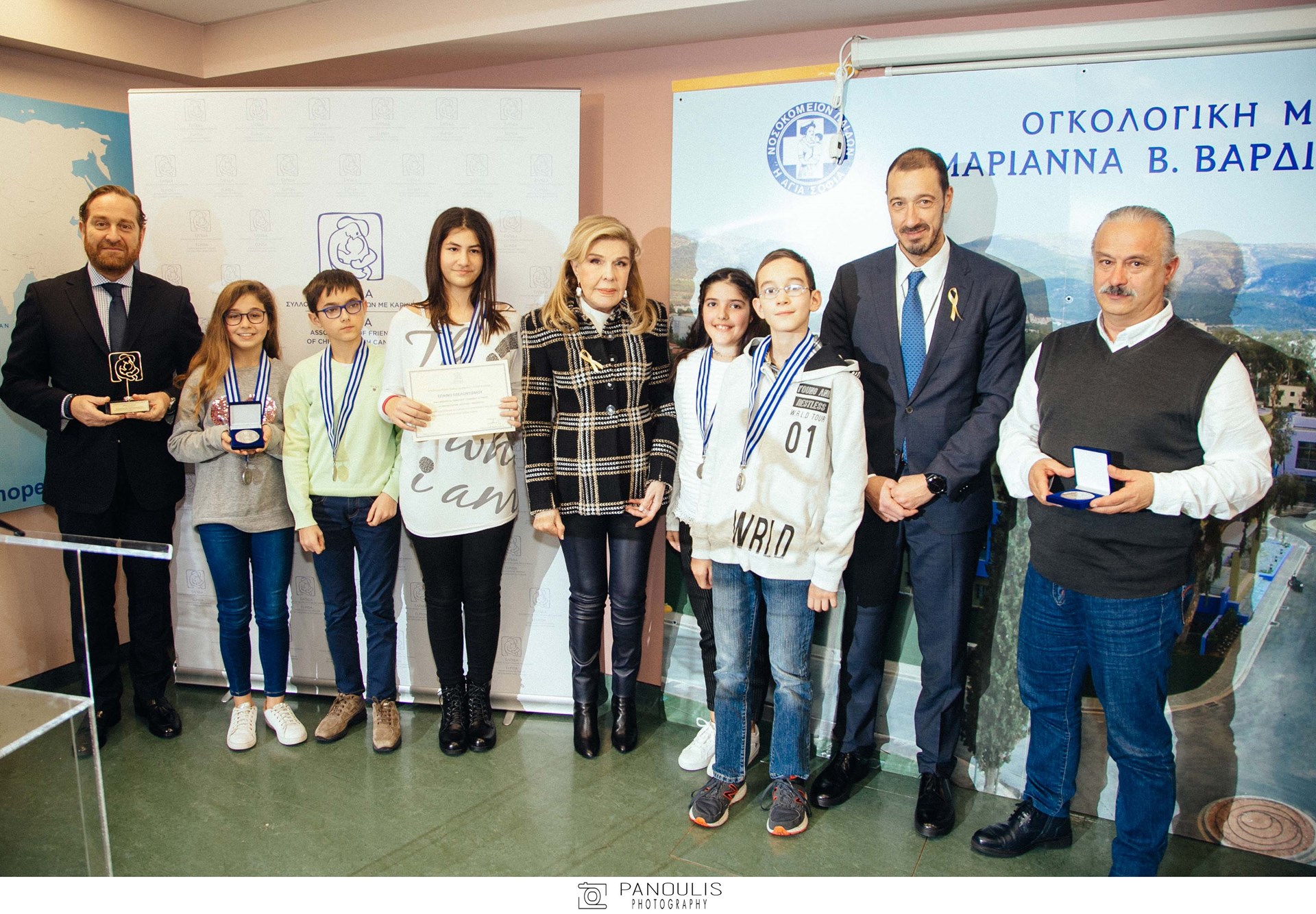 Αμέσως μετά, τα σχολεία τιμήθηκαν από την κυρία Βαρδινογιάννη με το Βραβείο Εκτίμησης ενώ κάθε ένας από τους μικρούς μαθητές παρέλαβε το Μετάλλιο Υποστηρικτή. Σε όλους τους παρευρισκόμενους μοιράστηκαν και τα Χρυσά Κορδελάκια που συμβολίζουν διεθνώς τον αγώνα κατά του καρκίνου στην παιδική ηλικία.