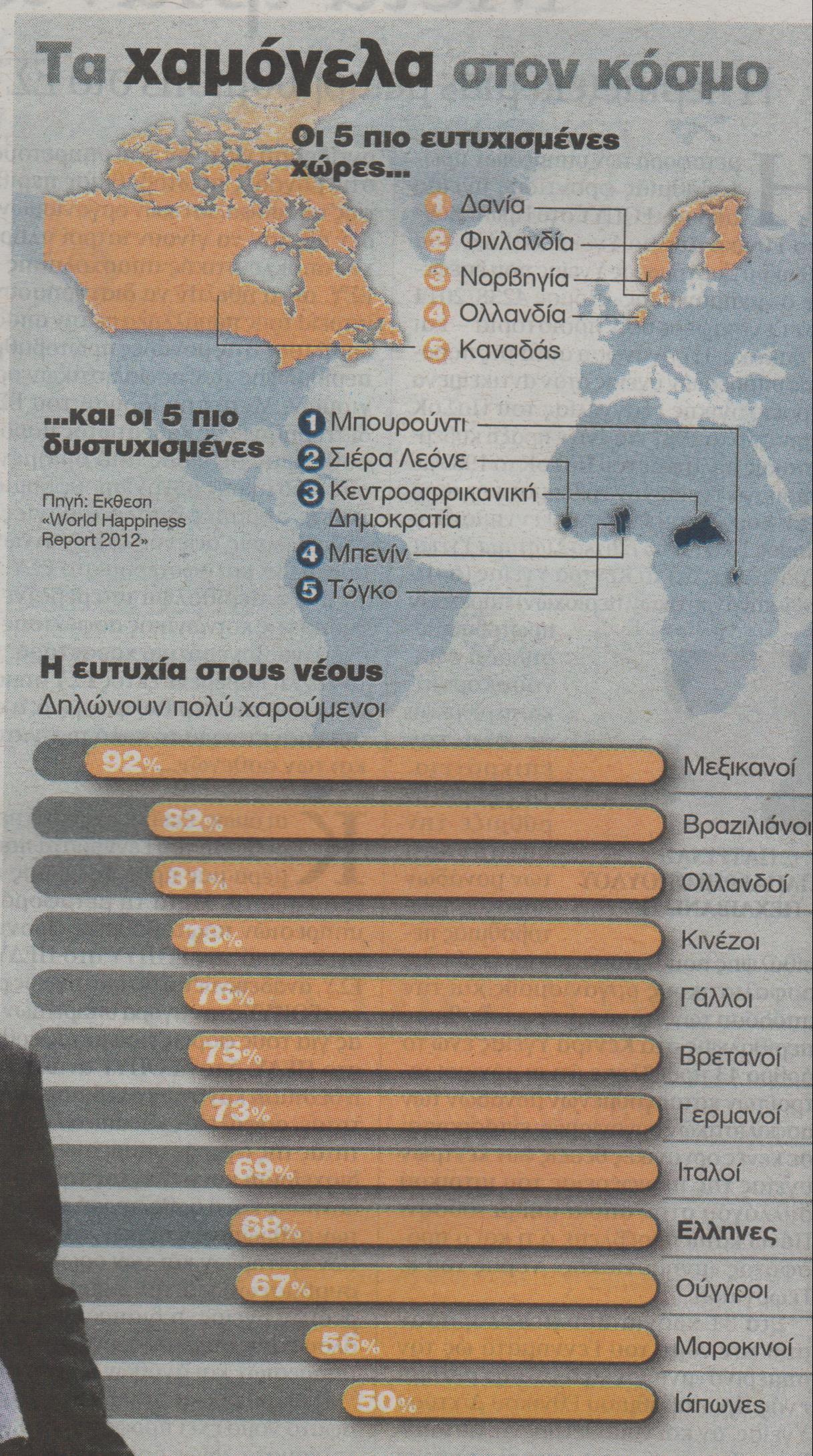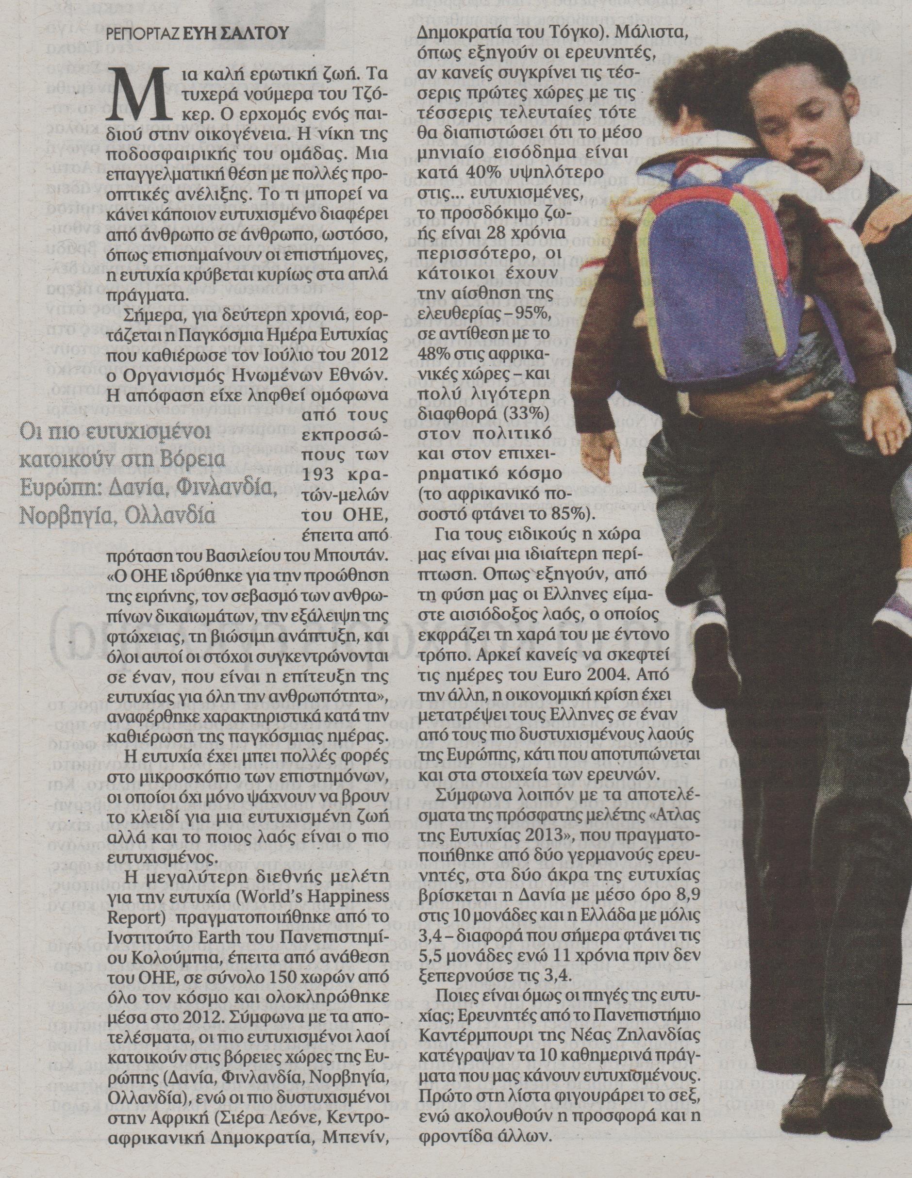 Σήμερα, για δεύτερη χρονιά, εορτάζεται η Παγκόσμια Ημέρα Ευτυχίας που καθιέρωσε τον Ιούλιο του 2012 ο Οργανισμός Ηνωμένων Εθνών. Η απόφαση είχε ληφθεί ομόφωνα από τους εκπροσώπους των 193 κρατών-μελών του ΟΗΕ, έπειτα από πρόταση του Βασιλείου του Μπουτάν.
