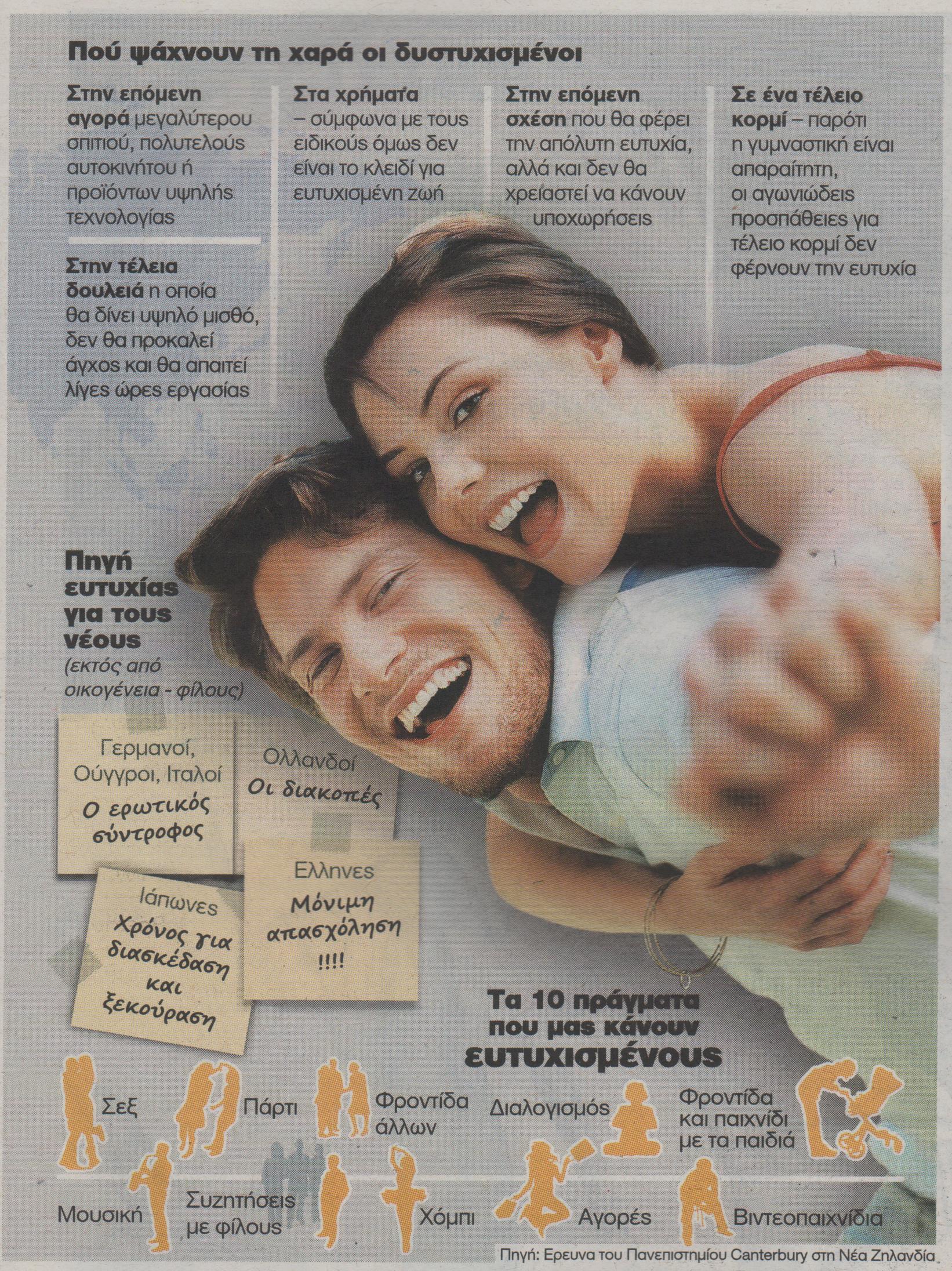 Μια καλή ερωτική ζωή. Τα τυχερά νούμερα του Τζόκερ. Ο ερχομός ενός παιδιού στην οικογένεια. Η νίκη της ποδοσφαιρικής του ομάδας. Μια επαγγελματική θέση με πολλές προοπτικές ανέλιξης. Το τι μπορεί να κάνει κάποιον ευτυχισμένο διαφέρει από άνθρωπο σε άνθρωπο, ωστόσο, όπως επισημαίνουν οι επιστήμονες, η ευτυχία κρύβεται κυρίως στα απλά πράγματα.