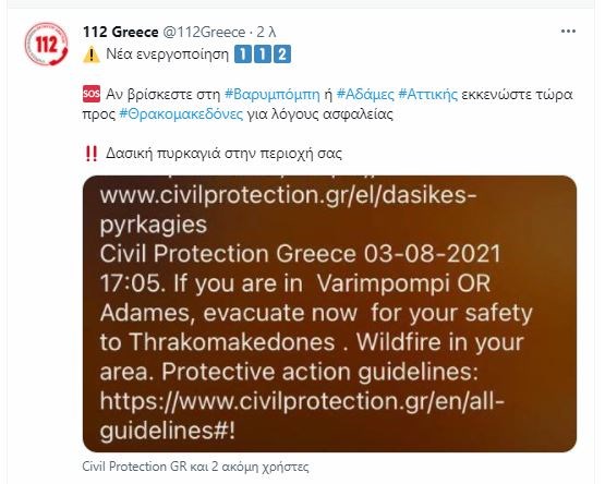 Νέο μήνυμα από το 112 για γενική απομάκρυνση των κατοίκων της Βαρυμπόμπης και του οικισμού Αδάμες εστάλη πριν από λίγα λεπτά. Το μήνυμα αναφέρει: «Αν είστε στη Βαρυμπόμπη ή στις Αδάμες εκκενώστε προς Θρακομακεδόνες για λόγους ασφαλείας».