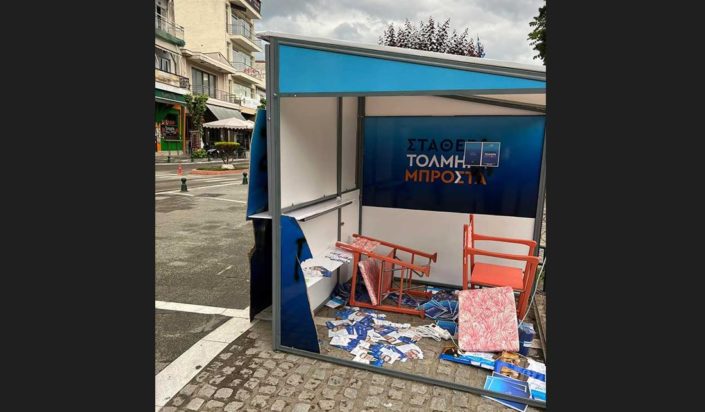 “Γυαλιά καρφιά” έκαναν άγνωστοι, το περίπτερο της Νέας Δημοκρατίας, στην Πτολεμαΐδα.
