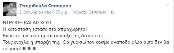 Οργισμένη και αγανακτισμένη η Σπυριδούλα Φατούρου, μητέρα της Ασπασίας, ξεσπά με αναρτήσεις της στο Facebook για την άδικη απόφαση του κράτους να κόψει την αναπηρική σύνταξη του παιδιού της, που δεν είναι πάνω από 350 ευρώ.