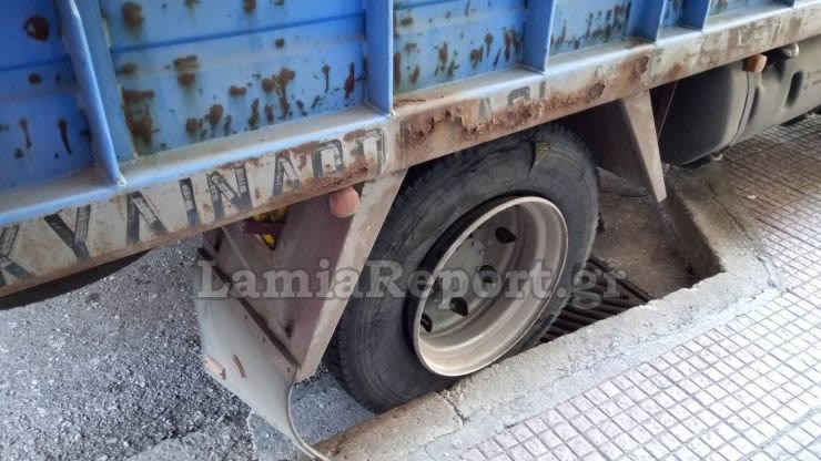 Το φορτηγό επιχειρούσε να ανεβεί σε πεζοδρόμιο μπροστά σε επιχείρηση όπου θα ξεφόρτωνε τσουβάλια με προϊόντα και χρησιμοποίησε σιδερένιο πέδιλο (τάκο) για τη στήριξη του πίσω λάστιχου.