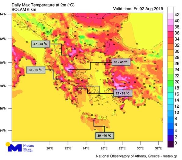 Οι εκτιμώμενες μέγιστες θερμοκρασίες κατά τις μεσημεριανές ώρες της Παρασκευής 02/08 θα φτάσουν τους 39 – 40 ⁰C, τονίζει το meteo.gr.