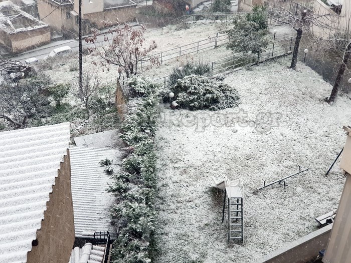 Όπως φαίνεται στις φωτογραφίες που έστειλε αναγνώστης του enikos.gr, οι σκεπές των σπιτιών και ο δρόμος έχουν καλυφθεί από χιόνι.