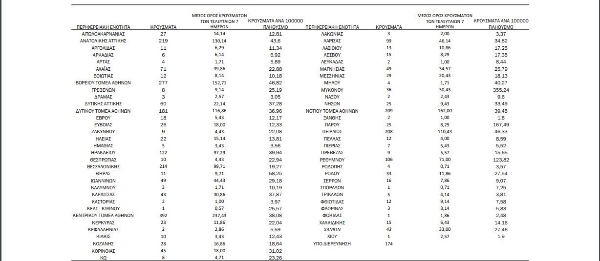 Διψήφιος αριθμός κρουσμάτων κατεγράφη επίσης σε Αιτωλοακαρνανία (27), Αργολίδα (11), Αχαΐα (71), Βοιωτία (12), Έβρο (18), Εύβοια (26), Ηλεία (22), Θεσπρωτία (10), Θήρα (11), Ιωάννινα (49), Καρδίτσα (43), Κέρκυρα (23), Κιλκίς (10), Κοζάνη (28), Κορινθία (45), Λάρισα (99), Λέσβο (15), Μαγνησία (49), Μεσσηνία (29), Μύκονο (36), Πάρο (25), Πέλλα (12), Ρόδο (33), Σέρρες (16), Φθιώτιδα (12) και Χαλκιδική (15), ενώ 174 τελούν υπό διερεύνηση.