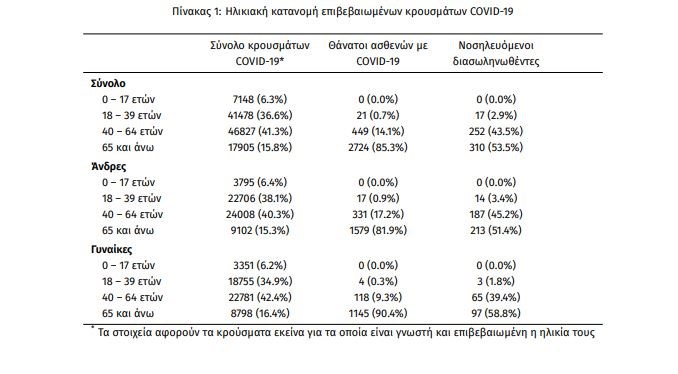 Σύμφωνα με τον πίνακα του ΕΟΔΥ, οι 21 ασθενείς που έχουν καταλήξει από επιπλοκές του κορονοϊού είναι ηλικίας μικρότερης των 40 ετών, οι 449 ανήκουν στην ηλικιακή ομάδα των 40-64 ετών και οι 2.724 είναι ηλικίας 65 ετών και άνω. Μεταξύ των διασωληνωμένων ασθενών, είναι και 17 άνθρωποι ηλικίας έως και 39 ετών. Οι 252 ασθενείς ανήκουν στην ηλικιακή ομάδα 40-64 ετών και η πλειοψηφία των διασωληνωμένων (310) είναι 65 ετών και άνω.