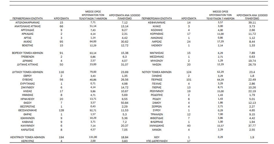 Σταθερά τριψήφιο νούμερο κατέγραψε η Θεσσαλονίκη με 128, ενώ το πρόβλημα παραμένει μεγάλο σε Αχαΐα, Εύβοια και Ρέθυμνο. Συγκεκριμένα στην πρώτη καταγράφηκαν 95 νέα κρούσματα, στη δεύτερη 56, ενώ στον νομό της Κρήτης 19.