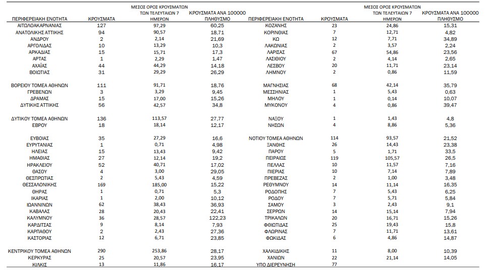 Στη Θεσσαλονίκη εντοπίστηκαν 169 κρούσματα, ενώ στην Αχαΐα 44, την Εύβοια 35, το Ηράκλειο 52, τα Ιωάννινα 62, την Κάλυμνο 36, τη Μαγνησία 68 και τη Λάρισα 67.
