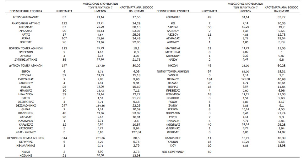 Ταυτόχρονα προβληματική φαίνεται να είναι η κατάσταση σε Αργολίδα (37), Αρκαδία (20), Βοιωτία (26), Εύβοια (32), Ηλεία (25), Ιωάννινα (40), Κορινθία (49), Λάρισα (56), Πέλλα (26), Ρέθυμνο (18) και Φθιώτιδα (40).