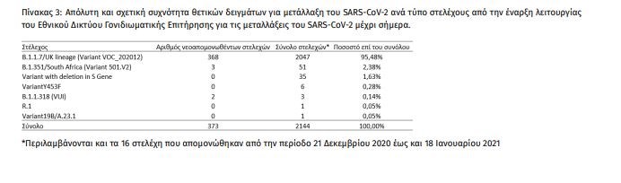 *Περιλαμβάνονται και τα 16 στελέχη που απομονώθηκαν από την περίοδο 21 Δεκεμβρίου 2020 έως και 18 Ιανουαρίου 2021