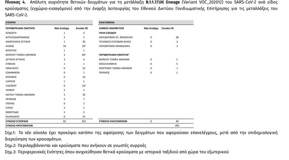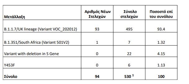 Eθνικό Δίκτυο Γονιδιωματικής Επιτήρησης για τις μεταλλάξεις του SARS-CoV-2 Ολοκληρώθηκε η γονιδιωματική ανάλυση σε 178 επιλεγμένα νέα δείγματα που αφορούν στην περίοδο 29 Δεκεμβρίου 2020 έως και 3 Φεβρουαρίου 2021. Τα δείγματα προέρχονται από τις Περιφέρειες Ανατολικής Μακεδονίας και Θράκης, Κεντρικής Μακεδονίας, Αττικής και τις Περιφερειακές Ενότητες Βοιωτίας, Λέσβου, Μυκόνου, Αχαΐας, Λακωνίας, Καρδίτσας και Λάρισας. Στο σύνολο των δειγμάτων που αναλύθηκαν, όλα πληρούσαν τα αυστηρά κριτήρια ποιότητας που απαιτούνται για την ανάλυση και ο τελικός έλεγχος ολοκληρώθηκε επιτυχώς. Από τον έλεγχο αναδείχθηκαν συνολικά 94 στελέχη με μεταλλάξεις ειδικού ενδιαφέροντος (variants of concern). Από τα 94 στελέχη τα 93 ήταν θετικά στη μετάλλαξη Β.1.1.7/UK lineage (Variant VOC_202012) ενώ 1 στέλεχος στη μετάλλαξη Lineage B.1.351/South Africa (Variant 501V2) (Πίνακας 3). Συνολικά έχουν ταυτοποιηθεί 495 θετικά στελέχη για την παρουσία μετάλλαξης Β.1.1.7/UK lineage (Variant VOC_202012) και 9 για την παρουσία μετάλλαξης B.1.351/South Africa (Variant 501V2) από την έναρξη λειτουργίας του Εθνικού Δικτύου Γονιδιωματικής Επιτήρησης για τις μεταλλάξεις του SARS-CoV-2 έως σήμερα. Τα 9 θετικά για την παρουσία μετάλλαξης Lineage B.1.351/South Africa (Variant 501V2) είναι όλα εγχώρια κρούσματα, εκ των οποίων 7 προέρχονται από την Περιφερειακή Ενότητα Θεσσαλονίκης και 2 από την Περιφερειακή Ενότητα Ιωαννίνων.