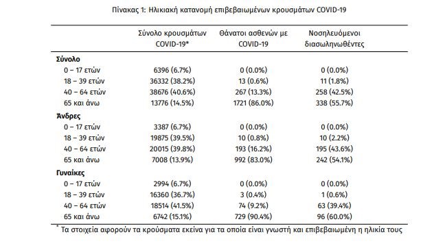 Τέλος, έχουμε 99 ακόμα καταγεγραμμένους θανάτους και 2001 θανάτους συνολικά στη χώρα. 806 (40.3%) γυναίκες και οι υπόλοιποι άνδρες. Η διάμεση ηλικία των θανόντων συμπολιτών μας ήταν τα 80 έτη και το 97.1% είχε κάποιο υποκείμενο νόσημα ή/και ηλικία 70 ετών και άνω.