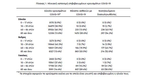 Όπως αποτυπώνεται και στην έκθεση του ΕΟΔΥ, ο κορονοϊός δεν κάνει διακρίσεις στις ηλικίες. Δέκα άνθρωποι, ηλικίας 18-39 ετών, έχουν χάσει τη ζωή τους από επιπλοκές της νόσου, ενώ στην ίδια ηλικιακή ομάδα ανήκουν οι 15 εκ των διασωληνωμένων ασθενών. Οι 14 είναι άνδρες και μία γυναίκα.