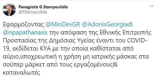 «Εφαρμόζοντας την απόφαση της Εθνικής Επιτροπής Προστασίας της Δημόσιας Υγείας έναντι του COVID-19, εκδίδεται ΚΥΑ με την οποία καθίσταται από αύριο,υποχρεωτική η χρήση μη ιατρικής μάσκας στα σούπερ μάρκετ από τους εργαζομένους& καταναλωτές», ανέφερε στην ανάρτησή του ο κ. Σταμπουλίδης. Σύμφωνα με πληροφορίες από το υπουργείο Ανάπτυξης και Επενδύσεων η κοινή υπουργική απόφαση υπεγράφη σήμερα και ισχύει από αύριο.