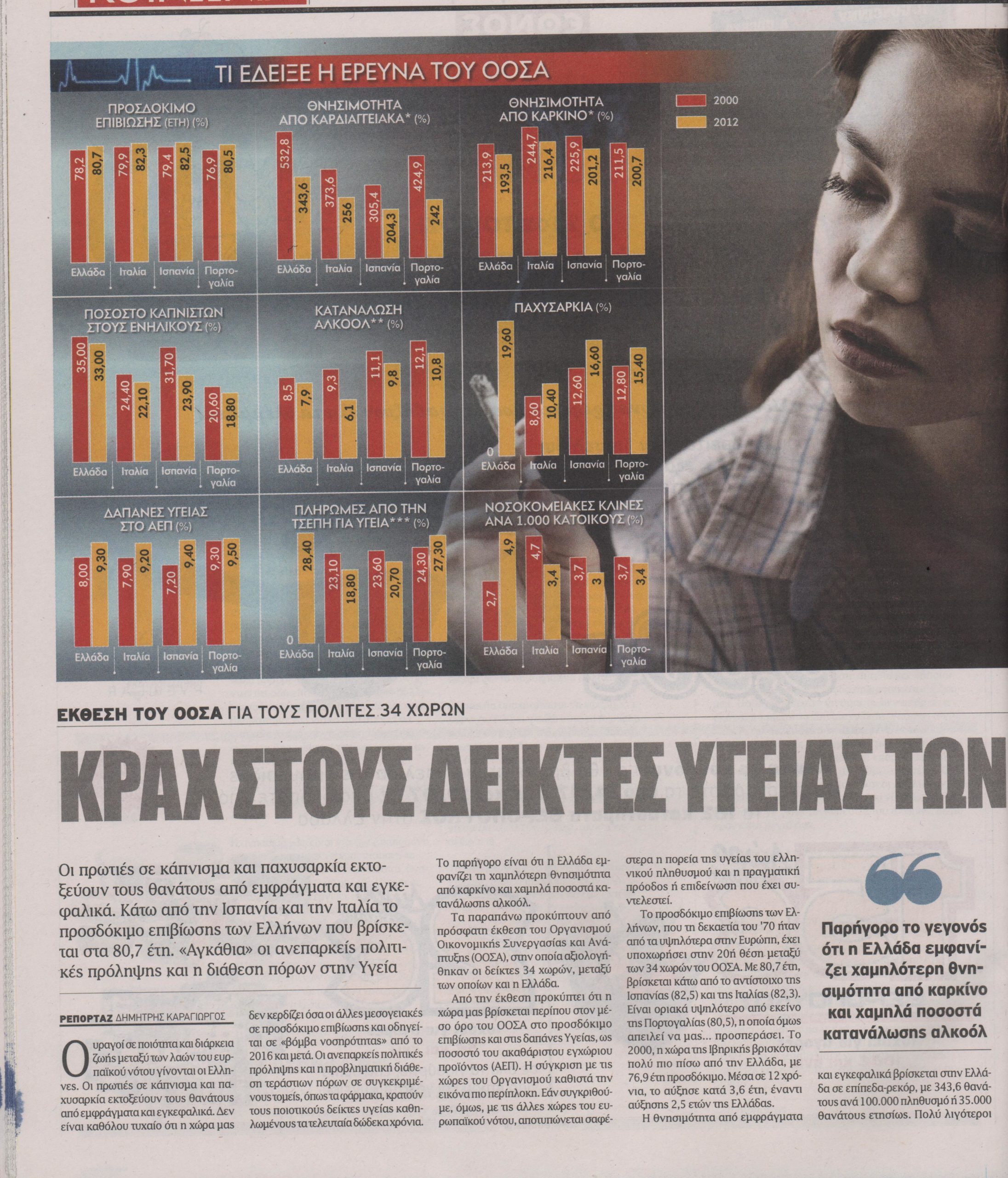 Από την έκθεση προκύπτει ότι η χώρα μας βρίσκεται περίπου στο μέσο όρο του ΟΟΣΑ στο προσδόκιμο επιβίωσης και στις δαπάνες Υγείας, ως ποσοστό του ακαθάριστου εγχώριου προϊόντος (ΑΕΠ).
