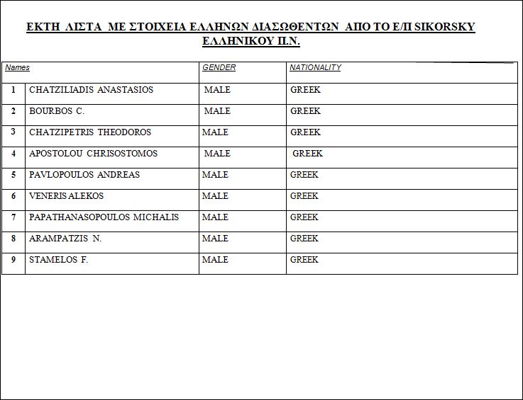 Επισυνάπτεται έκτη λίστα με στοιχεία των Ελλήνων διασωθέντων που παρελήφθησαν από το ανώτερο ελικόπτερο του ελληνικού Πολεμικού Ναυτικού.