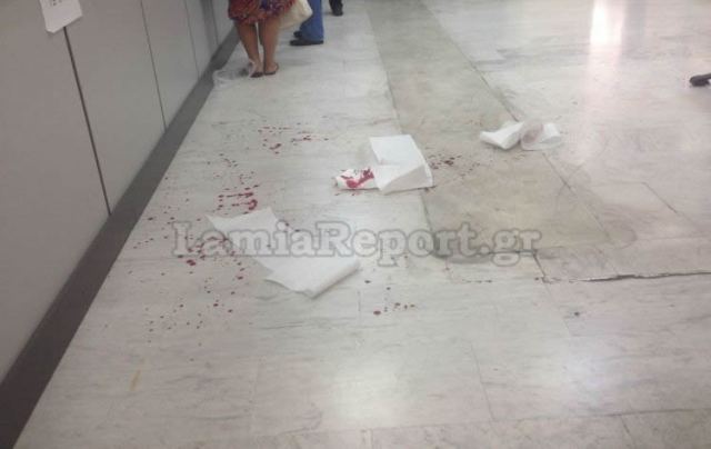 Στην φωτογραφία, βλέπετε το σημείο μπροστά στο γκισέ που αυτοτραυματίστηκε