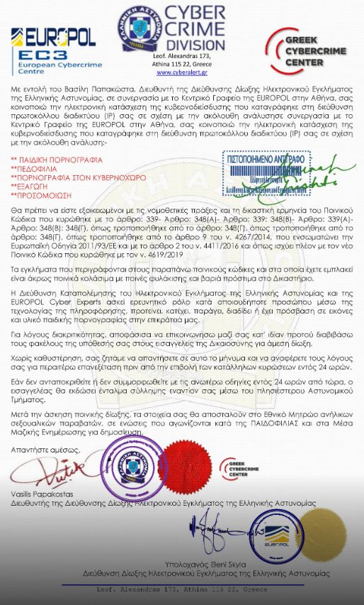 Το εν λόγω κείμενο – μήνυμα που διακινείται μέσω ηλεκτρονικού ταχυδρομείου (email), ως δήθεν επιστολή του Διευθυντή της Διεύθυνσης Δίωξης Ηλεκτρονικού Εγκλήματος, η οποία φέρει το ονοματεπώνυμό του, καθώς και ψευδή σφραγίδα με επιγραφή «EUROPOL και υπογραφή «Υπολοχαγός Eleni Skyla» είναι καταφανώς ψευδεπίγραφο και απατηλό και αποστέλλεται από δράστες που επιχειρούν προφανώς να εξαπατήσουν – παραπλανήσουν τους πολίτες και ακολούθως να αποκομίσουν παράνομο οικονομικό όφελος, προειδοποιεί η Ελληνική Αστυνομία.