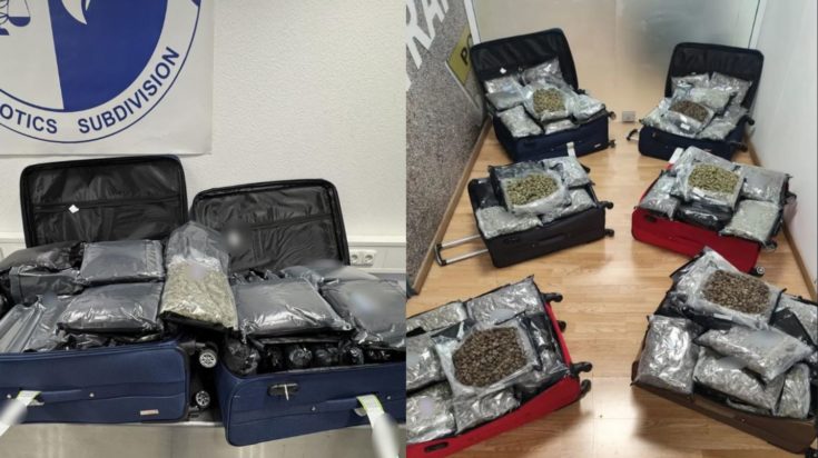 Από τον έλεγχο που πραγματοποιήθηκε στις αποσκευές τους, συνολικά κατελήφθησαν να έχουν αποκρύψει σε νάιλον συσκευασίες εντός των αποσκευών τους, 72 κιλά και 700 γραμμάρια ακατέργαστης κάνναβης υδροπονικής καλλιέργειας (skunk).