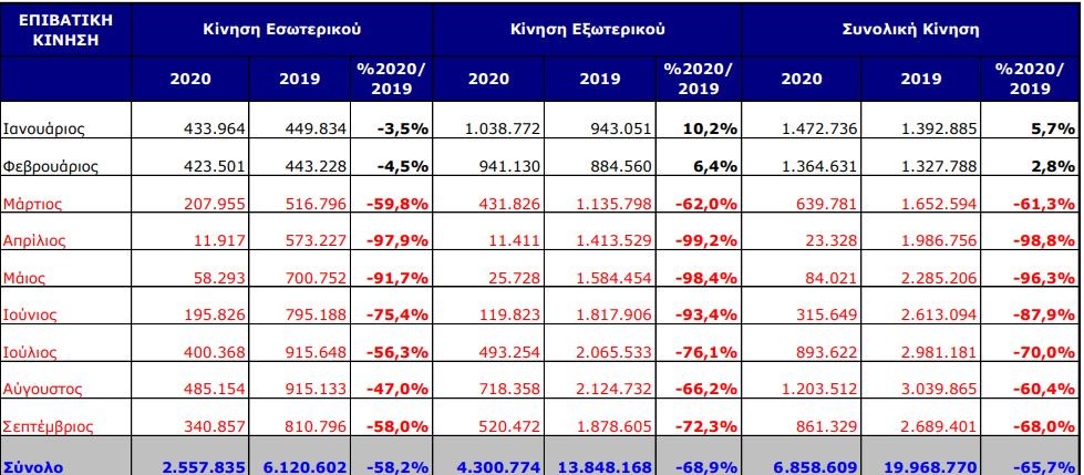 Χαρακτηριστικό της κατάστασης είναι η τεράστια “βουτιά” της επιβατικής κίνησης κατά τον μήνα Σεπτέμβριο σε σχέση με το 2019. Συγκεκριμένα, όπως αναφέρουν τα επίσημα στοιχεία που έχουν αναρτηθεί από το Διεθνή Αερολιμένα Αθηνών, η κίνηση του Σεπτεμβρίου επηρεάστηκε σημαντικά από την πανδημία του κορονοϊού. “Η επιβατική κίνηση του αεροδρομίου ανήλθε στις 861 χιλιάδες επιβάτες περίπου, μειωμένη κατά 68% σε σχέση με τα αντίστοιχα επίπεδα του 2019.Οι επιβάτες, τόσο των πτήσεων εσωτερικού όσο και των διεθνών πτήσεων, κατέγραψαν μείωση της τάξης του 58% και 72,3% αντίστοιχα. Συνολικά, κατά την περίοδο Ιανουαρίου-Σεπτεμβρίου, η κίνηση του αεροδρομίου ανήλθε στο επίπεδο των 6,9 εκατ. επιβατών, σημειώνοντας πτώση της τάξης του 65,7% σε σχέση την αντίστοιχη περίοδο του 2019, λόγω των επιπτώσεων της πανδημίας κατά την περίοδο Μαρτίου-Σεπτεμβρίου. Η διεθνής κίνηση μειώθηκε κατά 68,9%, ενώ οι επιβάτες εσωτερικού παρουσίασαν πτώση της τάξης του 58,2%”.