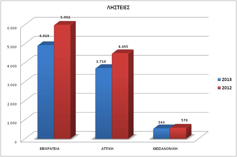 – Σε σύγκριση με το 2012, οι ανθρωποκτονίες μειώθηκαν σε ποσοστό 11,9%, οι ληστείες κατά 17,9%, οι κλοπές-διαρρήξεις κατά 15,2% και οι κλοπές τροχοφόρων κατά 7,6.