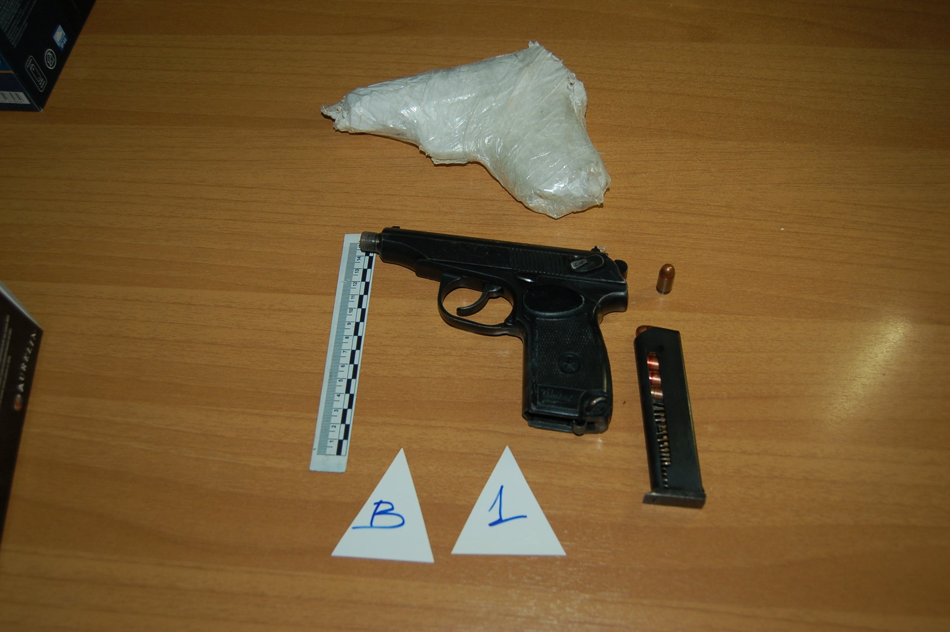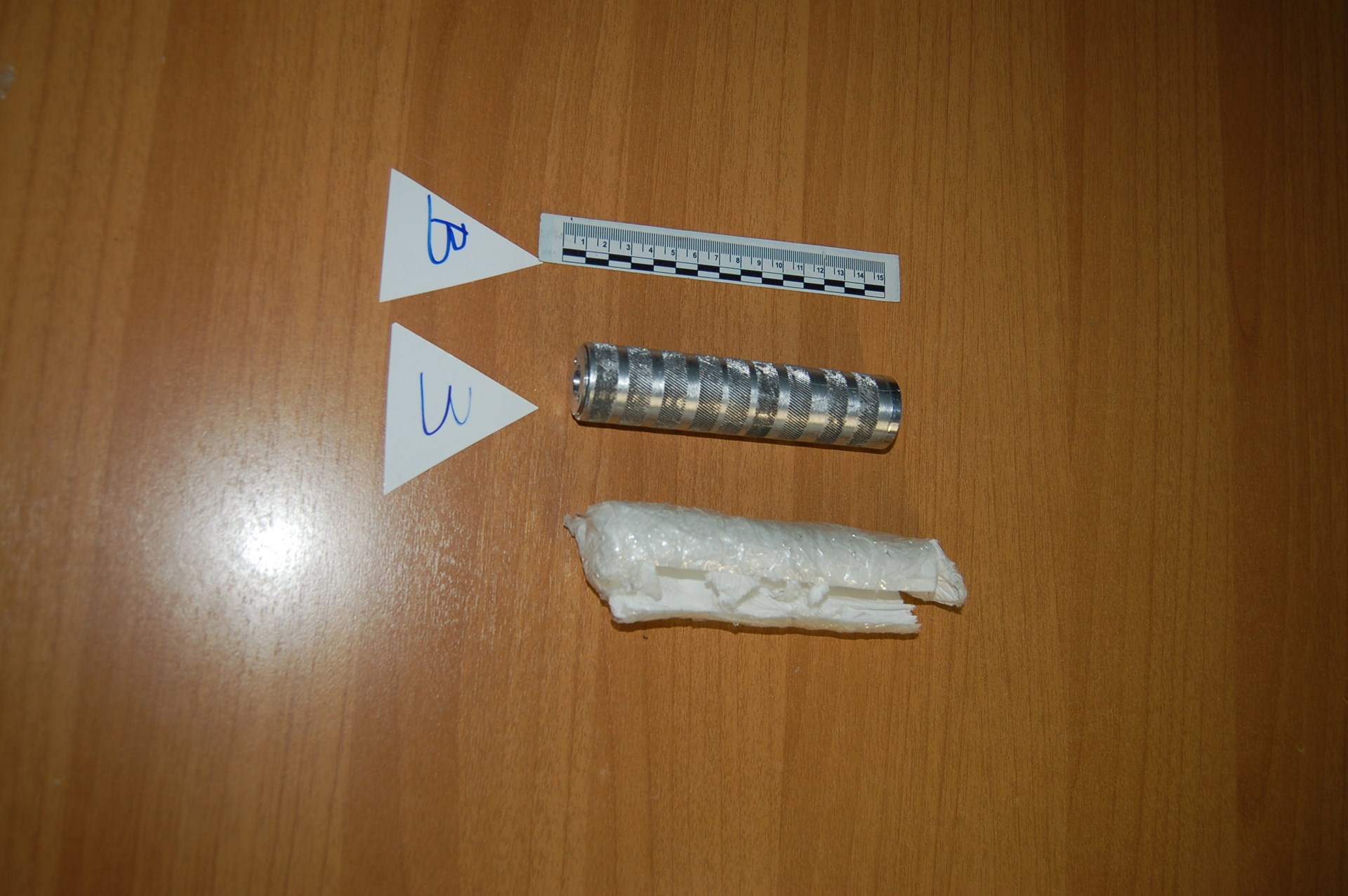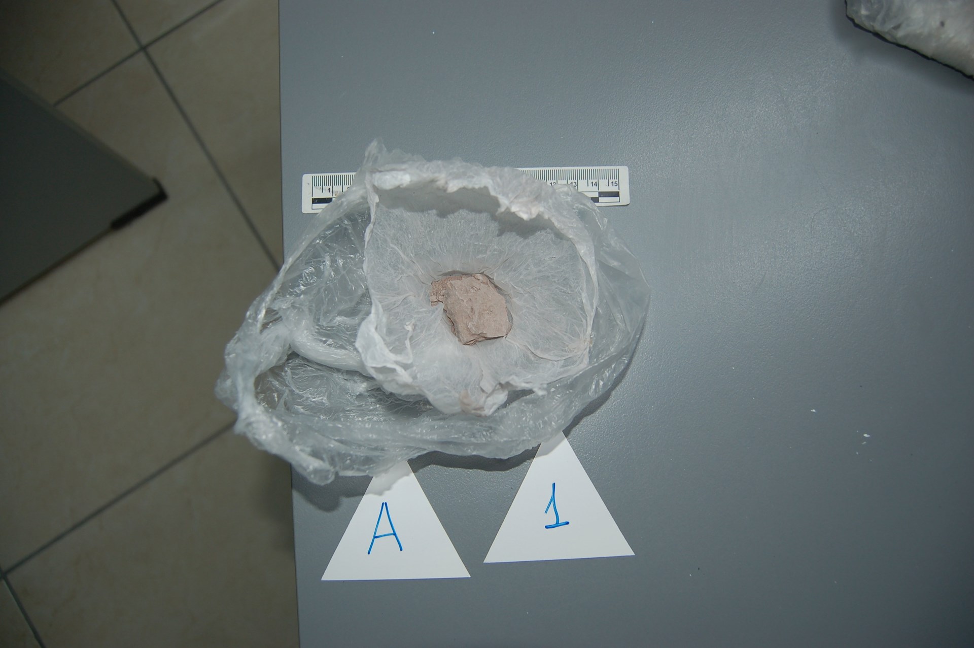 - αυτοσχέδια νάιλον συσκευασία με ναρκωτική ουσία, πιθανόν ηρωίνη, σε μορφή βράχου συνολικού μεικτού βάρους 9,1 γραμμαρίων.