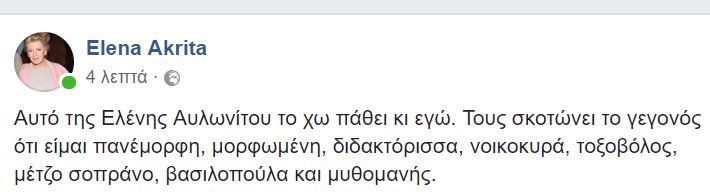 Με ανάρτησή της στην προσωπική της σελίδα στο Facebook, η Έλενα Ακρίτα σχολίασε τη δήλωση της βουλευτού του ΣΥΡΙΖΑ Ελένης Αυλωνίτου, η οποία είπε μεταξύ άλλων: “Έχω τον συνδυασμό που “σκοτώνει”. Είμαι ωραία και μορφωμένη”.