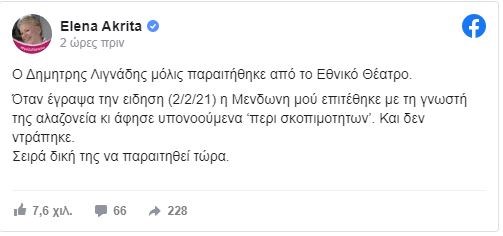 Η Έλενα Ακρίτα είχε γράψει συγκεκριμένα: “Η Λίνα Μενδώνη ζήτησε την παραίτηση του καλλιτεχνικού διευθυντή του Εθνικού Θεατρου Δημήτρη Λιγνάδη, σύμφωνα με αξιόπιστες δημοσιογραφικές πηγές. Θα παρακαλούσα να μη γίνουν εικασίες γύρω από τους λόγους της παραίτησης. Επισήμως ακόμα τίποτα δεν είναι γνωστό”.