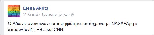 Με ένα χιουμοριστικό σχόλιο στο Facebook αναφέρθηκε στην υποψηφιότητα του Άδωνι Γεωργιάδη για τη θέση του προέδρου της Νέας Δημοκρατίας, η Έλενα Ακρίτα.