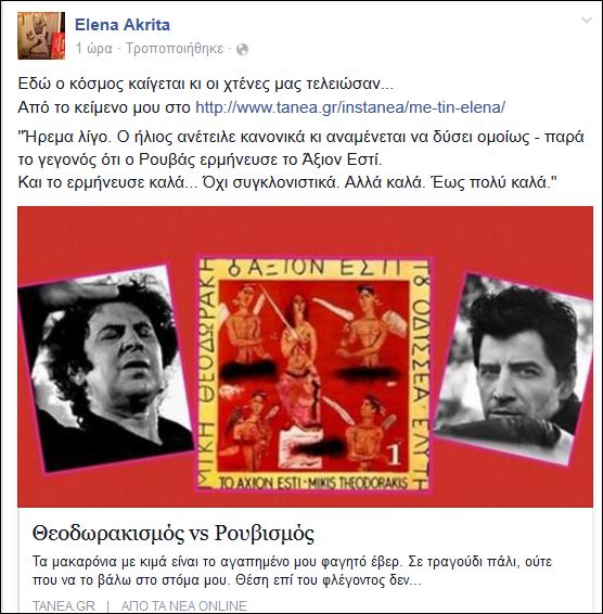 Η Έλενα Ακρίτα σχολίασε την ερμηνεία του «Άξιον Εστί» από τον Σάκη Ρουβά στη συναυλία που πραγματοποιήθηκε το Σάββατο στη Νέα Σμύρνη. Η δημοσιογράφος με ένα κείμενο της που δημοσιεύεται στην ηλεκτρονική σελίδα της εφημερίδας «Τα Νέα» με τίτλο «Θεοδωρακισμός vs Ρουβισμός», τονίζει μεταξύ άλλων: «Λιθοβολήστε με, αλλά μου άρεσε. Χίλια συγγνώμη στους γκουρού της πολιτικής κορεκτίλας, αλλά βούλωσε στόματα».