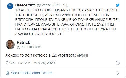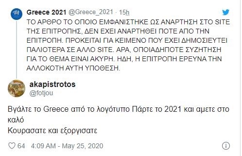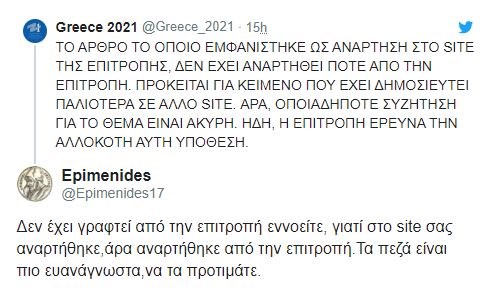 Το άρθρο “κατέβηκε” και στη συνέχεια η Επιτροπή -με tweet από τον επίσημο λογαριασμό Greece 2021- δήλωσε ότι δεν το ανέβασε ποτέ κι επομένως «οποιαδήποτε συζήτηση για το θέμα είναι άκυρη». Βέβαια, η Επιτροπή βάσει πληροφοριών που διαρρέονται στον Τύπο, παρουσιάζεται έτοιμη να ερευνήσει το θέμα και ενδεχομένως να ζητήσει τη συνδρομή των ελληνικών Αρχών για να βρεθεί το άτομο που χωρίς να λάβει σχετική άδεια, τουλάχιστον αυτό υποστηρίζει η Επιτροπή, ανέβασε στο site ένα κείμενο, το οποίο δεν είχε λάβει έγκριση από κάποιον υπεύθυνο.