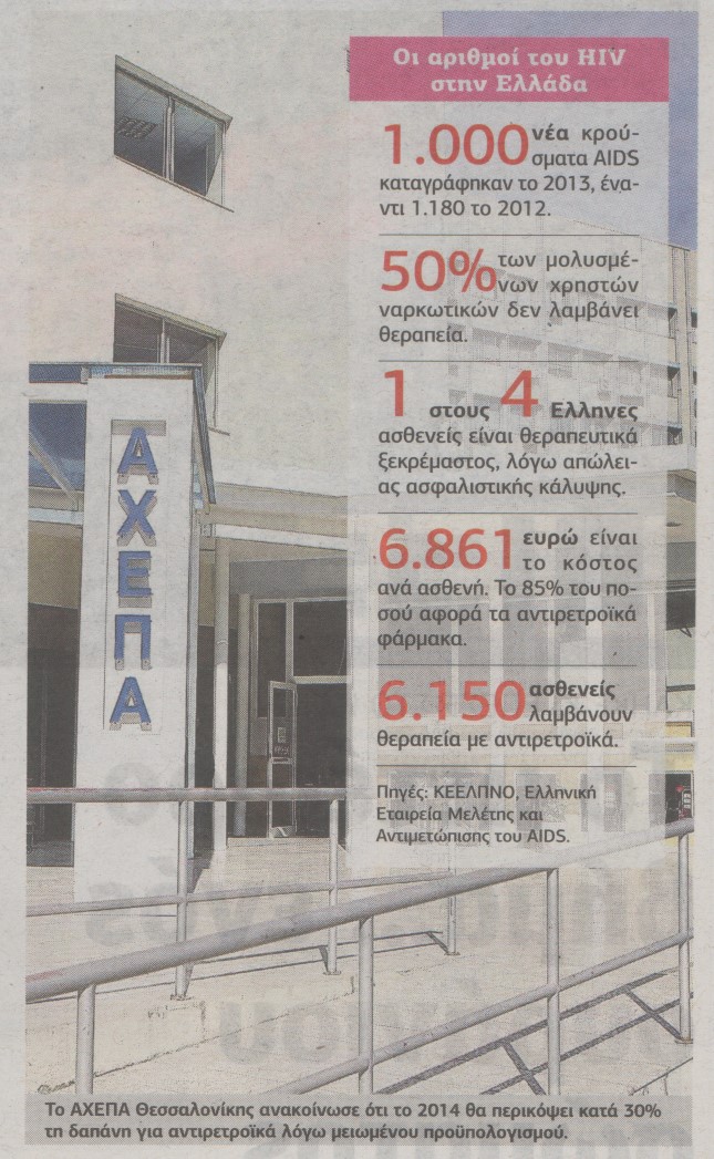 Παράλληλα, οι ειδικοί της Ελληνικής Εταιρείας Μελέτης και Αντιμετώπισης του AIDS εκφράζουν φόβους ότι θα περιοριστούν οι δαπάνες στους προυπολογισμούς των δημοσίων νοσοκομείων για αντιρετροικά φάρμακα το 2014, λόγω των μνημονιακών περικοπών στην Υγεία, ενώ ήδη αρκετοί Έλληνες ασθενείς μένουν ξεκρέμαστοι σε ότι αφορά τη θεραπεία τους και λαμβάνουν αντιρετροικα φάρμακα αποκλειστικά χάρη στην υπέρβαση που κάνουν οι γιατροί των Μονάδων Λοιμώξεων.