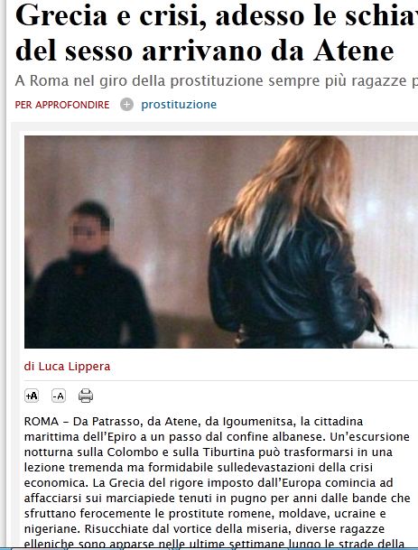 Όπως σημειώνει ο δημοσιογράφος που υπογράφει το κείμενο, άντρες της Ιταλικής αστυνομίας εντόπισαν νεαρές Ελληνίδες από την Πάτρα, την Ηγουμενίτσα να κάνουν πεζοδρόμιο μαζί με δύο γυναίκες από τη Βουλγαρία, κοντά στο κέντρο της Ρώμης.