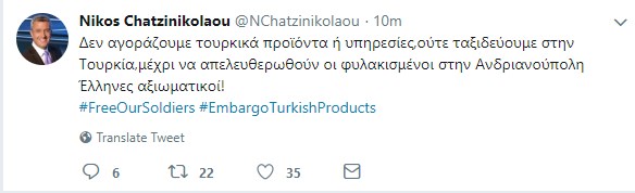 “Σαν πολίτης και σαν δημοσιογράφος θα στηρίξω με όση δύναμη έχει η φωνή μου την απόφαση των συμπολιτών των ενός εκ των δύο αξιωματικών στην Ορεστιάδα, να σταματήσουν να αγοράζουν τουρκικά προϊόντα και να σταματήσουν να επισκέπτονται τουριστικά την Τουρκία. Πρέπει να το κάνουμε όλοι μαζί μέχρι να επιστρέψουν τα παλικάρια μας στα σπίτια τους”.