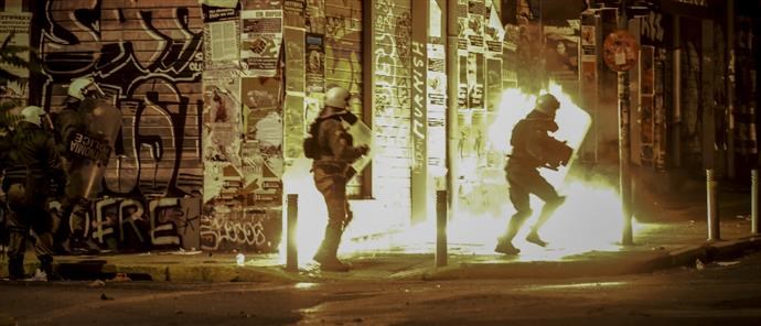 Σε εμπόλεμη ζώνη μετατράπηκαν οι δρόμοι γύρω από το Πολυτεχνείο καθώς οι κουκουλοφόροι, μόλις ολοκληρώθηκε η πορεία προς την αμερικανική πρεσβεία, έστησαν οδοφράγματα κι άρχισαν να εκσφενδονίζουν βόμβες μολότοφ, πέτρες και άλλα αντικείμενα εναντίον των αστυνομικών δυνάμεων στην περιοχή των Εξαρχείων.
