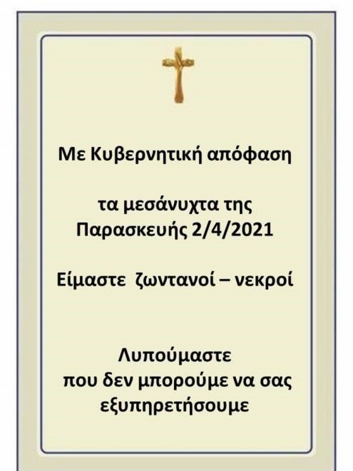 -Όλοι την Δευτέρα το πρωί στις 9:00 στα καταστήματα μας χωρίς προσωπικό, με φώτα και την πόρτα μας ανοιχτή , με όλα τα ατομικά μέτρα προστασίας χωρίς να εξυπηρετούμε καταναλωτές. Αναρτούμε το αφισάκι – κηδειόχαρτο του Συλλόγου και μαύρες σημαίες.
