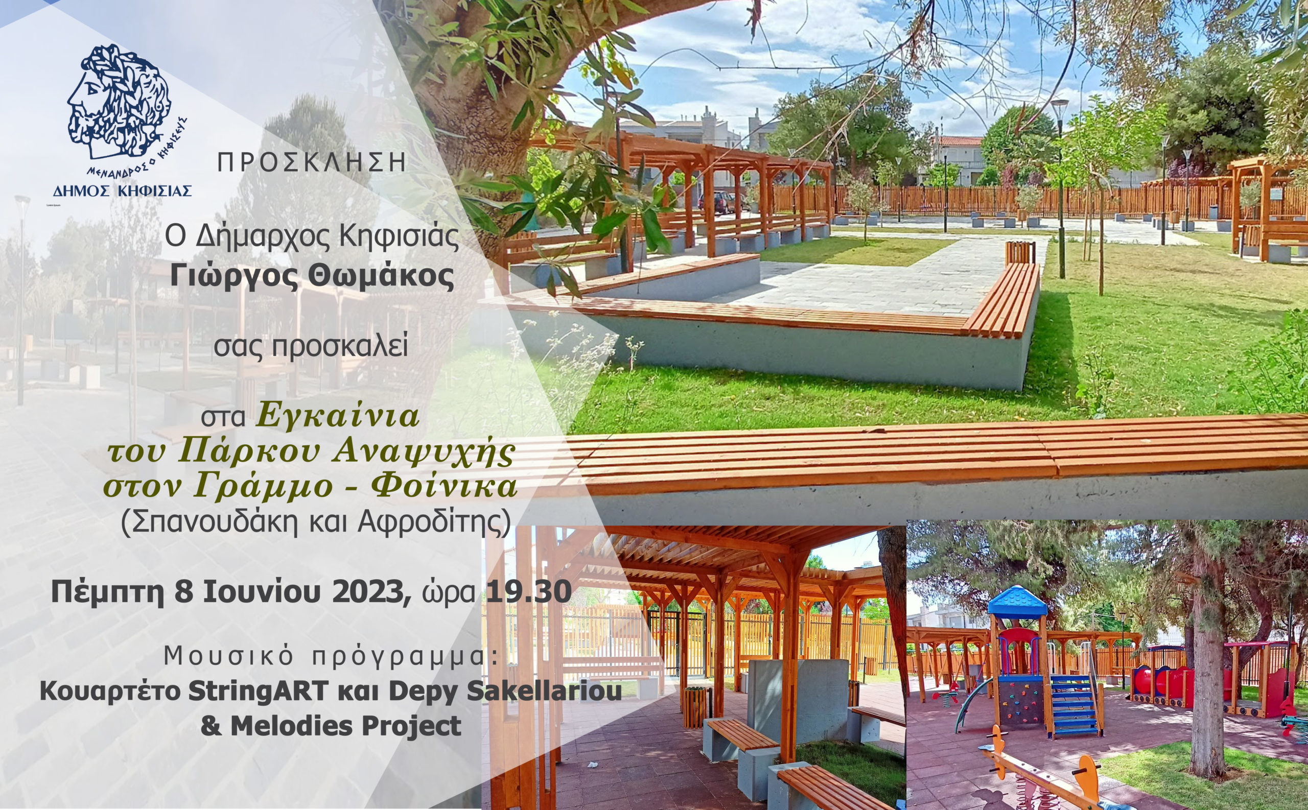 Ένα νέο όμορφο πάρκο αναψυχής παραδίδει ο Δήμος Κηφισιάς στους πολίτες του. Ο Δήμαρχος Κηφισιάς Γιώργος Θωμάκος, μας προσκαλεί στα εγκαίνια την σήμερα, Πέμπτη 8 Ιουνίου 2023 στις 19.30 για να γιορτάσουμε όλοι μαζί στον νέο χώρο αναψυχής στον Δήμο μας.