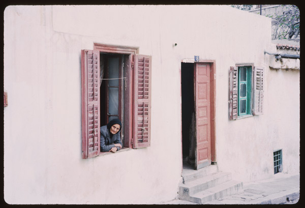 Μία ηλικιωμένη γυναίκα χαζεύει από το παράθυρο του σπιτιού της στη γραφική συνοικία της Πλάκας.
