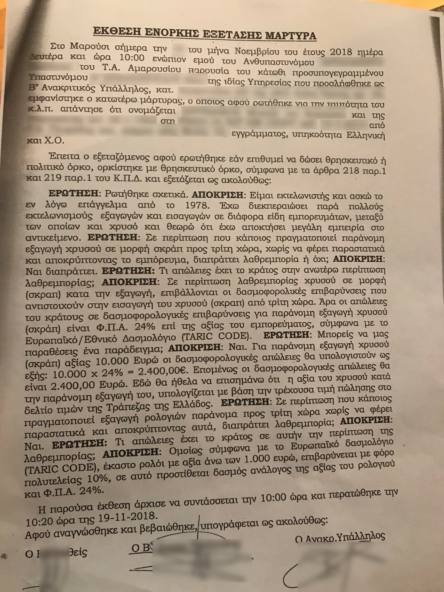 “Είμαι εκτελωνιστής και ασκώ το εν λόγω επάγγελμα από το 1978. Έχω διεκπεραιώσει πάρα πολλούς εκτελωνισμούς εξαγωγών και εισαγωγών σε διάφορα είδη εμπορευμάτων, μεταξύ των οποίων και χρυσό και θεωρώ ότι έχω αποκτήσει μεγάλη εμπειρία στο αντικείμενο».
