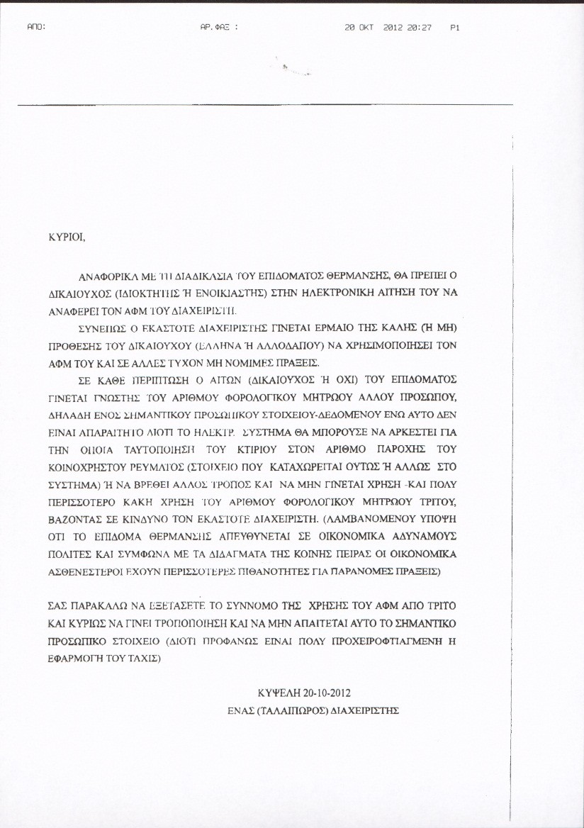 Αναγνώστης του enikos.gr μας έστειλε μια επιστολή στην οποία επισημαίνει τους κινδύνους που εγκυμονεί για τους διαχειριστές των πολυκατοικιών η διαδικασία για το επίδομα θέρμανσης.