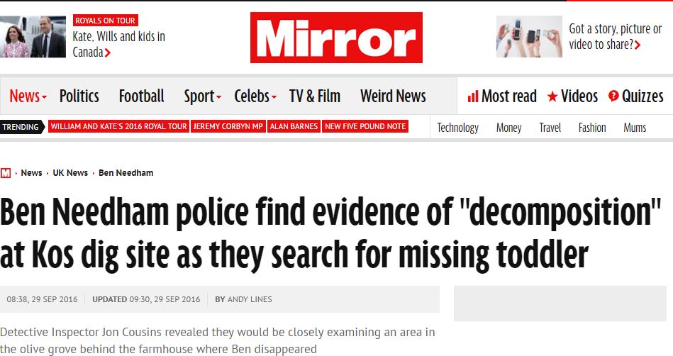 «Αρχίσαμε να σκάβουμε στη βάση μιας συκιάς μετά από μια φωτογραφία που έδειξε ότι φυτεύτηκε όταν το παιδί είχε ήδη εξαφανιστεί. Αξιωματικοί ανέλυσαν την εικόνα και διαπίστωσαν ότι τραβήχτηκε 10 μέρες μετά την εξαφάνιση του μικρού Μπεν. Είναι η παλιότερη καταγραφή και αυτός είναι ο λόγος που επικεντρώνουμε τις προσπάθειές μας σε αυτό το σημείο», είπε ο Cousins.