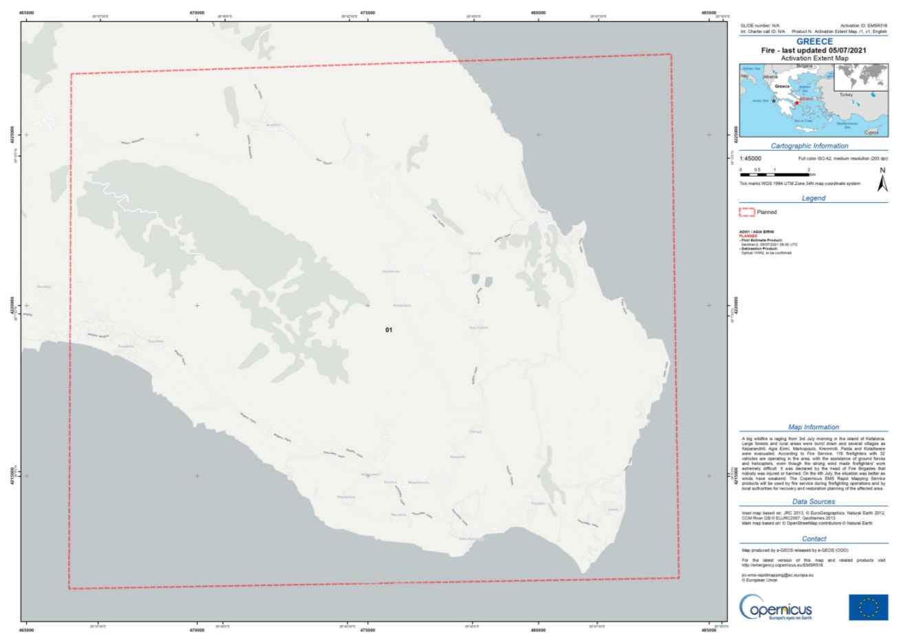 Σκοπός της ενεργοποίησης είναι η παραγωγή χαρτογραφικών προϊόντων και δεδομένων για την περιοχή της Κεφαλονιάς η οποία επλήγη από δασική πυρκαγιά που εκδηλώθηκε το Σάββατο 3 Ιουλίου, προς υποβοήθηση του έργου των φορέων που εμπλέκονται στην αντιμετώπιση εκτάκτων αναγκών και στη διαχείριση των συνεπειών του φαινομένου.
